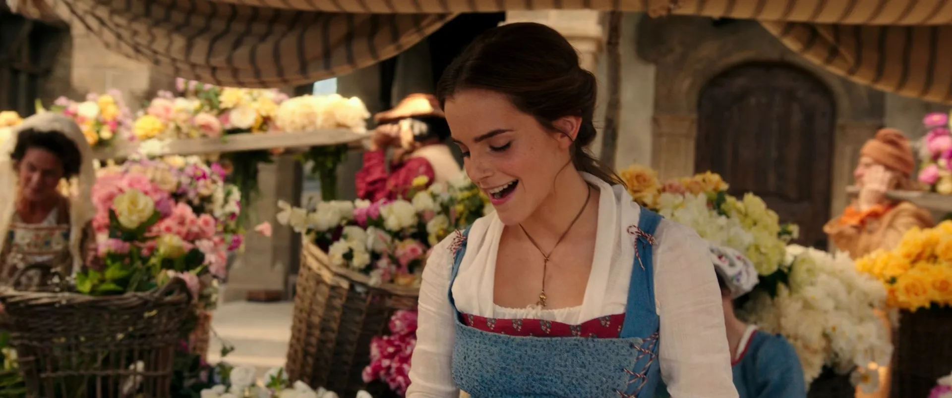 Cast: Emma Watson as Belle, Dan Stevens as Beast, Luke Evans as Gaston, Josh Gad as LeFou, Kevin Kline as Maurice, Hattie Morahan as Agathe / Enchantress, Haydn Gwynne as Clothilde, Gerard Horan as Jean the Potter, Ray Fearon as Père Robert, Ewan McGregor as Lumière, Ian McKellen as Cogsworth, Emma Thompson as Mrs. Potts, Nathan Mack as Chip, Audra McDonald as Madame Garderobe, Stanley Tucci as Maestro Cadenza, Gugu Mbatha-Raw as Plumette, Clive Rowe as Cuisinier, Thomas Padden as Chapeau, Rita Davies as Old Woman, D.J. Bailey as Vagrant, Adrian Schiller as Monsieur D'Arque, Harriet Jones as Queen, Adam Mitchell as Young Prince, Tom Turner as King, Michael Jibson as Tavern Keeper, Zoe Rainey as Belle's Mother, Daisy Duczmal as Baby Belle, Jolyon Coy as Young Maurice, Jimmy Johnston as Tom, Dean Street as Dick, Alexis Loizon as Stanley, Sophie Reid as Village Lass, Rafaëlle Cohen as Village Lass, Carla Nella as Village Lass, Obioma Ugoala as Flirtatious Farmer, Lynne Wilmot as Barmaid, Jane Fowler as Pretty Female Fishmonger, Alison Harding as Head Washer, Chris Andrew Mellon as Nasty Headmaster, Jemma Alexander as Housewife, Sandy Strallen as Cobbler, Dale Branston as Baker, Daniel Ioannou as Barber, Peter Challis as Butcher, Wendy Baldock as Washer Woman, Norma Atallah as Washer Woman, Leo Andrew as Apothecary, Steven Butler as Cheese Maker, Sharon Gomez as Cheese Maker, Jacqui Jameson as Cheese Maker, Vivien Parry as Village Lass's Mother, Simone Sault as Wood Carrier, Beth Willetts as Jam Seller, Mandy Montanez as Bread Buyer, Tom Oakley as Fishmonger, William Bozier as Stable Boy, Jak Allen-Anderson as Apothecary's Patient, Phil Grannel as Fiddler, Freddie August as Fiddler, Nicola Keen as Female Villager / Celebration Woman, Ebony Molina as Female Villager / Celebration Woman, Alison Jenkins as Female Villager / Celebration Woman, Ellen O'Grady as Female Villager, Dawn Buckland as Female Villager, Rebecca Mckinnis as Female Villager, Jody Hall as Male Villager, Ben Fox as Male Villager, Nathan Vaughan Harris as Male Villager, Tim Stanley as Male Villager, Ben Clare as Male Villager, Marina Abdeen as Debutante, Danielle Acors as Debutante, Hayley Ainsley as Debutante, Rhianne Alleyn as Debutante, Gabby Antrobus as Debutante, Sophie Atkins as Debutante, Koko Basigara as Debutante, Holly Bluett as Debutante, Daisy Boyles as Debutante, Ava Brennan as Debutante, Sophia Brown as Debutante, Sophie Carmen-Jones as Debutante, Cassie Clare as Debutante, Tanya Cumberland as Debutante, Natalie Davis as Debutante, Paige Drury-Lawrence as Debutante, Stephanie Elstob as Debutante, Cordelia Farnworth as Debutante, Cj Field as Debutante, Lily Frazer as Debutante, Lucy Alexa Gilbert as Debutante, Helen Gulstan as Debutante, Selina Hamilton as Debutante, Leah Hill as Debutante, Abigayle Honeywill as Debutante, Chelsea Inez as Debutante, Blythe Jandoo as Debutante, Shireen Jathoonia as Debutante, Billie Kay-Piper as Debutante, Hannah Kenna-Thomas as Debutante, Ella Kora as Debutante, Jennifer Leung as Debutante, Emily Loumba as Debutante, Cassie Macmillian as Debutante, Fiona McDonald as Debutante, Samira Mighty as Debutante, Sonoya Mizuno as Debutante, Anna Momcilovic as Debutante, Nicola Mooi as Debutante, Nicole O'Neill as Debutante, Abiona Omonua as Debutante, Jazz Peters as Debutante, Courtney Pruce as Debutante, Kayla Radam as Debutante, Katie Singh as Debutante, Lucy St Louis as Debutante, Ruth Steele as Debutante, Jasmine Takacs as Debutante, Naomi Weijand as Debutante, Leah West as Debutante, Skye Lucia Degruttola as Washer Girl, Timia Julien-Box as Little Girl, Adelaide Morgan as Little Girl, Gemma Fray as Little Girl, Lara Decaro as Little Girl, Max Brophy as School Boy, Samuel Brown as School Boy, Daniel Daszek-Green as School Boy, Freddie Hunter as School Boy, Joey Brown as School Boy, Tom Burgering as School Boy, Nate Leung as School Boy, Kai Gordon as School Boy, Oscar Francisco as School Boy, Harry Marcus as School Boy, Johanna Smitz as Village Woman (uncredited)